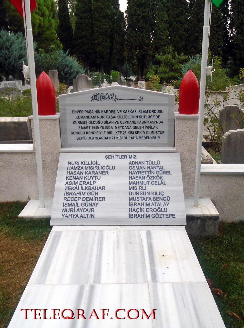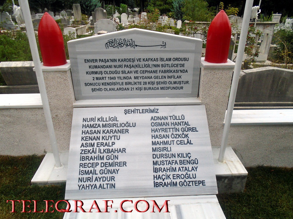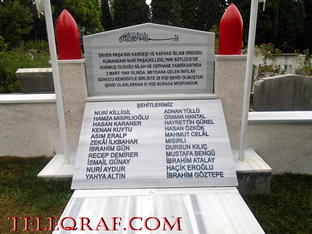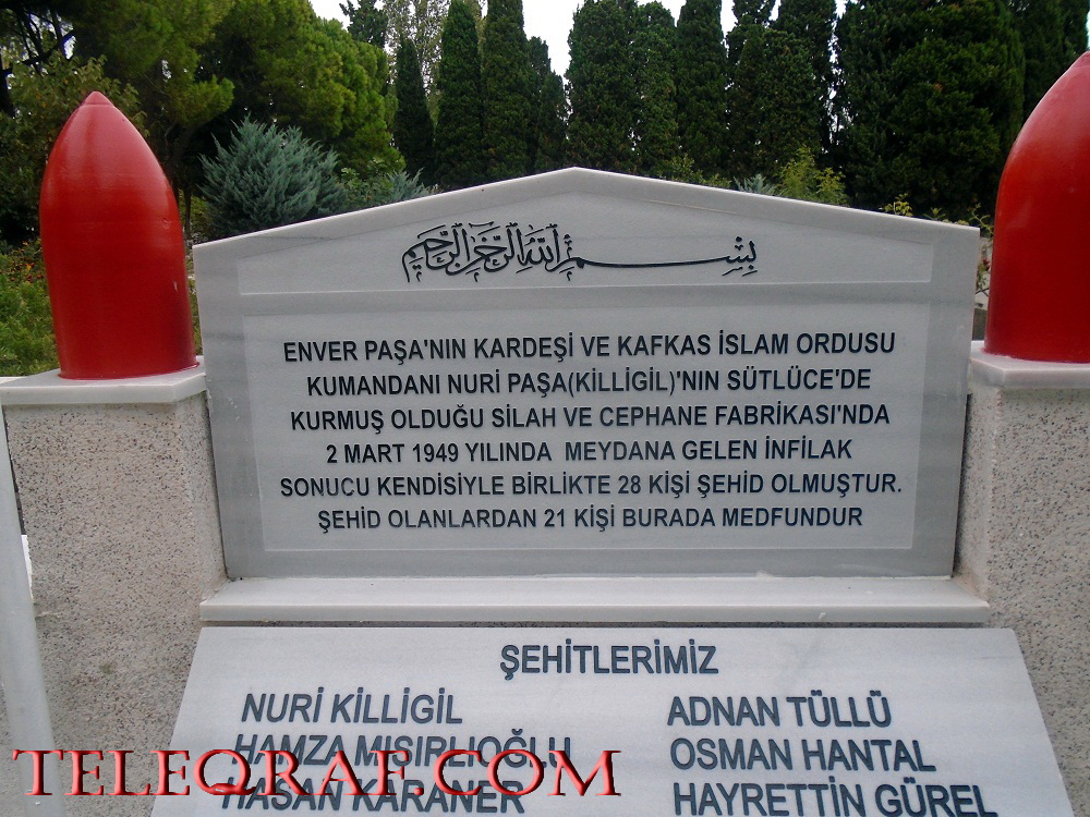 “Ənvər paşanın qardaşı və Qafqaz İslam Ordusu komandanı Nuru Paşanın (Killigil) Sütlücədə qurduğu silah fabrikində 2 mart 1949-cu ildə meydana gələn partlayış nəticəsində özü ilə birlikdə 28 şəxs şəhid olub. Şəhid olanlardan 21 nəfər burada dəfn olunub”.