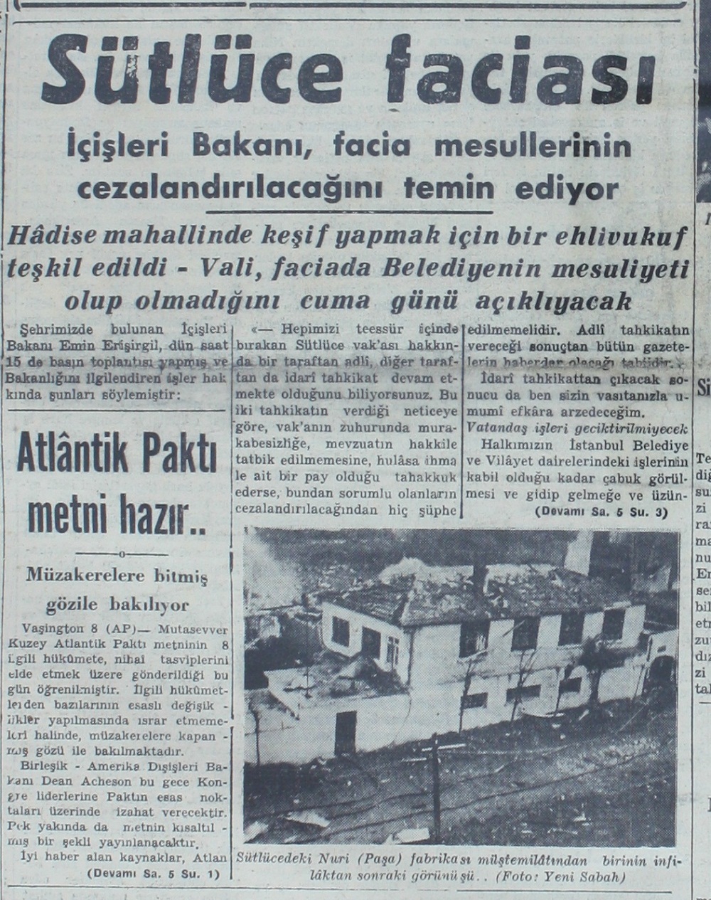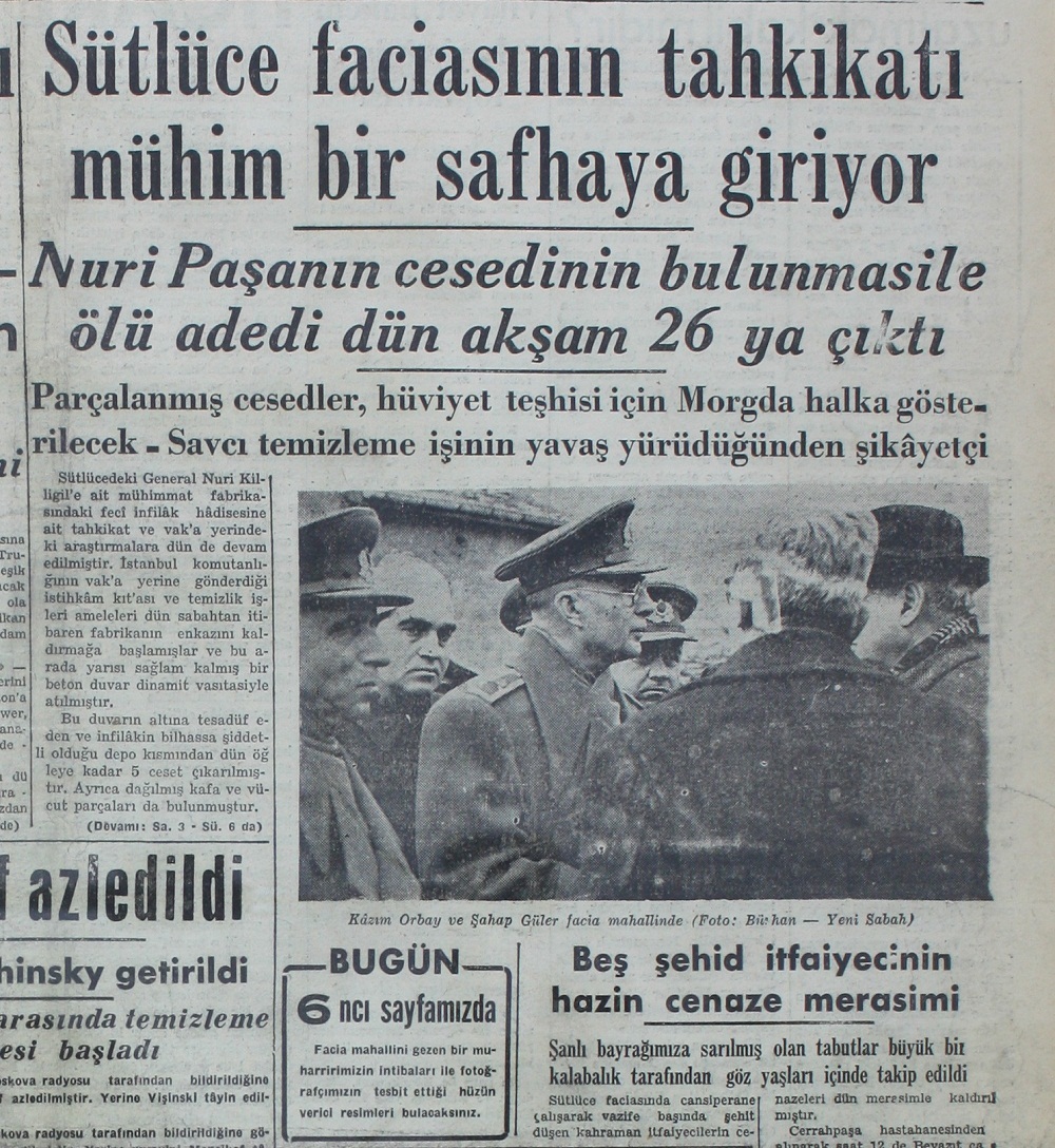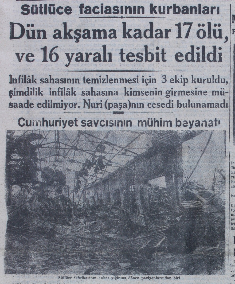 1949-cu il martın 1-də Nuru paşa Misirdən böyük həcmdə silah sifarişi alır. Lakin bir gün sonra Sütlücədəki Silah Fabrikində böyük partlayış baş verir. Silah anbarı havaya uçur. Ətrafdakı binalar yerlə-yeksan olur. Rəsmi sənədlərə görə, 27 nəfər həlak olur. Nuru paşanın cəsədi isə tikə-tikə olduğu üçün gec tapılır.