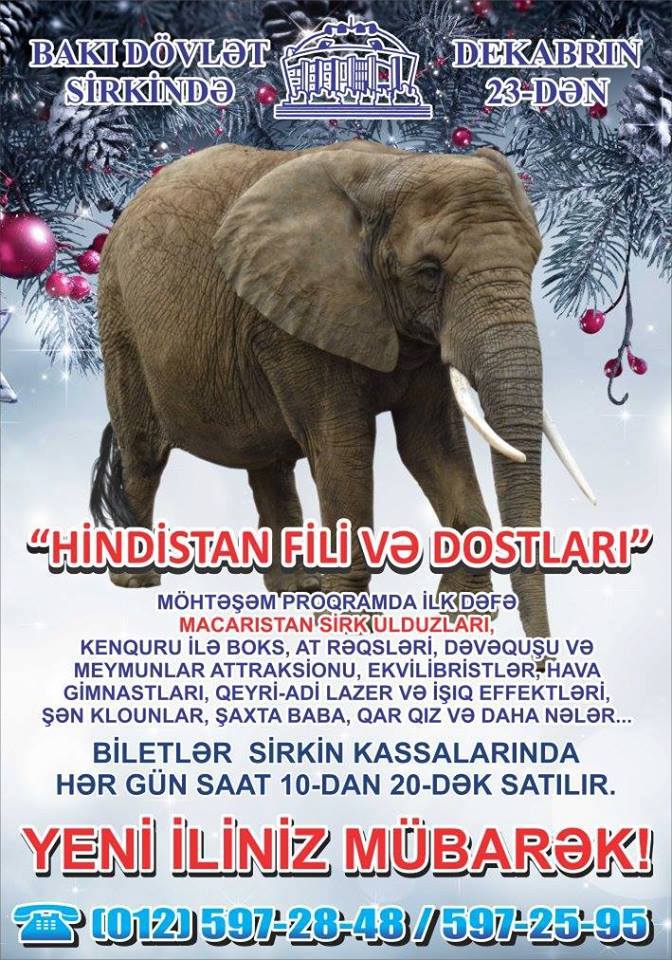 Dövlət Sirkində dekabrın 23-dən start verilən “Hindistan fili və dostları” adlı proqram yanvarın 10-dək davam edəcək. Bu yığma proqram üçün Bakı Dövlət Sirkinin tarixində ilk dəfə olaraq Macarıstandan sirk artistləri dəvət olunub.