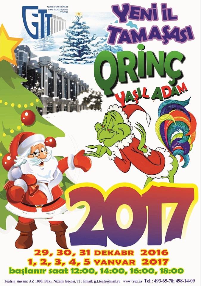 Gənc Tamaşaçılar Teatrı məktəblilərin qış tətili günləri üçün yeni tamaşa təqdim edəcək. Teodor Syuz Qeyzelin “Yeni ili oğurlayan Qrinç” kitabının motivləri əsasında Ron Hovardın ekran həyatı verdiyi “Qrinç” bu dəfə gənc rejissor Elşad Rəhimzadənin quruluşunda hazırlanacaq.