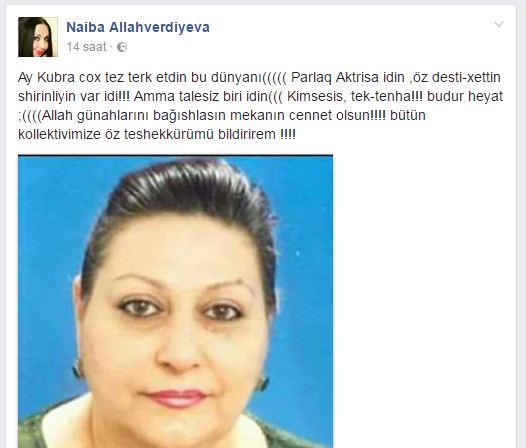Aktrisa Naibə Allahverdiyeva ötən gün dünyasını dəyişən əməkdar artist Kübra Daşaşovadan yazıb.