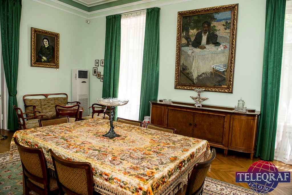 Masanın arxa divarında Səməd Vurğunun ailəvi və yazı masası ətrafında çəkilən fotosu var.