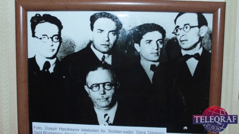 “Orda başqa bir görkəmli bəstəkarın şəkilini görə bilərsiniz. Müslüm Maqomayev Üzeyir bəylə eyni ildə, eyni ayda, eyni gündə dünyaya gəlib. Onlar Qori seminasiyasında oxuyarkən rastlaşıblar. Bu təsadüfi görüş dostluğa, sonralar isə qohumluq əlaqələrinə çevrilib. Belə ki, ikisi də bir ailənin iki qızı ilə ailə qururlar”.