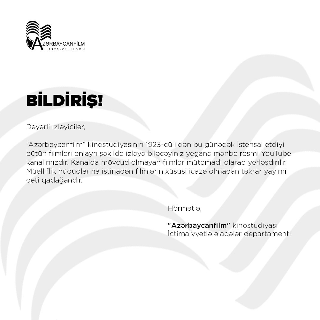 “Artıq tamaşaçılar “Azərbaycanfilm”in istehsal etdiyi filmləri onlayn şəkildə kinostudiyanın rəsmi Yutub kanalında izləyə bilərlər. Kanalda mövcud olmayan filmlər mütamadi olaraq yerləşdirilir. Müəllif hüquqlarına istinadən filmlərin xüsusi icazə olmadan təkrar yayımı qəti qadağandır”.