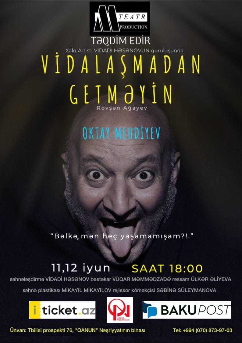 “Vidalaşmadan getməyin” tamaşasının premyerası 11-12 iyun, saat 18-də Qanun Nəşrlər Evinin (Tbilisi pr. 76) üçüncü mərtəbəsində keçiriləcək.