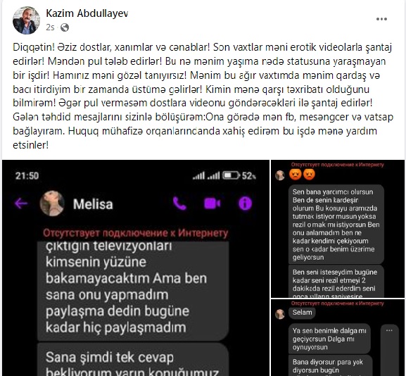 "Hamınız məni gözəl tanıyırsız. Mənim bu ağır vaxtımda - qardaş və bacı itirdiyim bir zamanda - üstümə gəlirlər. Kimin mənə qarşı təxribatı olduğunu bilmirəm. Əgər pul verməsəm, dostlara videonu göndərəcəkləri ilə şantaj edirlər!