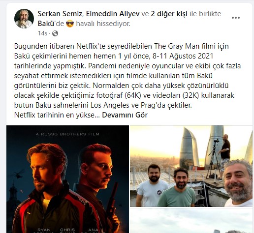 “Demək olar ki, bir il əvvəl, 8-11 avqust 2021-ci il tarixlərində bu gündən “Netflix”də yayımlanan “The Gray Man” filmi üçün Bakını çəkdik. Aktyorlar və çəkiliş qrupu pandemiya səbəbindən çox səyahət etmək istəmədiyi üçün filmdə istifadə olunan bütün Bakı görüntülərini biz çəkdik. Onlar isə Los-Anceles və Praqada bütün Bakı səhnələrini çəkiblər və bizim həmişəkindən daha keyfiyyətli çəkdiyimiz fotolar (64K) və videolardan (32K) istifadə ediblər.