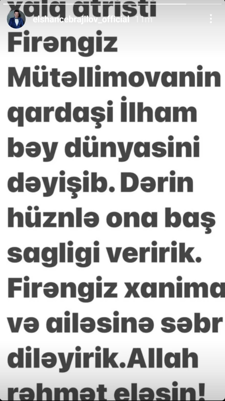 “Xalq artisti Firəngiz Mütəllimovanın qardaşı İlham bəy dünyasını dəyişib. Dərin hüznlə ona baş sağlığı veririk. Firəngiz xanıma və ailəsinə səbr diləyirik. Allah rəhmət eləsin” – paylaşımda deyilir.