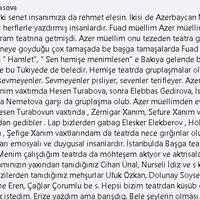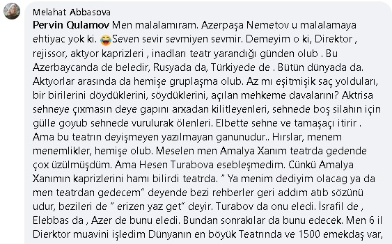 “Direktor, rejissor, aktyor kaprizləri, inadları teatr yarandığı gündən olub. Bu Azərbaycanda da belədir, Rusiyada da, Türkiyədə də. Aktyorlar arasında həmişə qruplaşma olub. Azmı eşitmişik saç yolduları, bir-birilərini döydüklərini, söydüklərini, açılan məhkəmə davalarını? Aktrisa səhnəyə çıxmasın deyə qapını arxadan kilidləyənləri, səhnədə boş silahın içinə güllə qoyub səhnədə vurularaq ölənləri. Əlbəttə səhnə və tamaşaçı itirir. Amma bu teatrın dəyişməyən, yazılmayan qanunudur”.