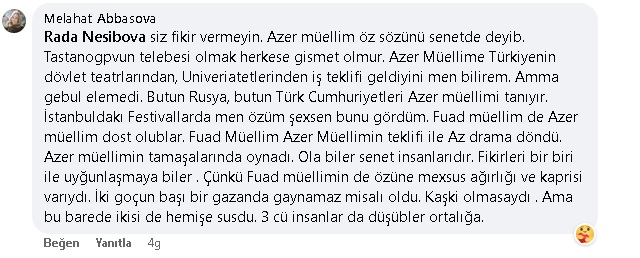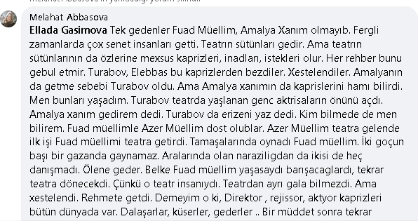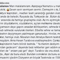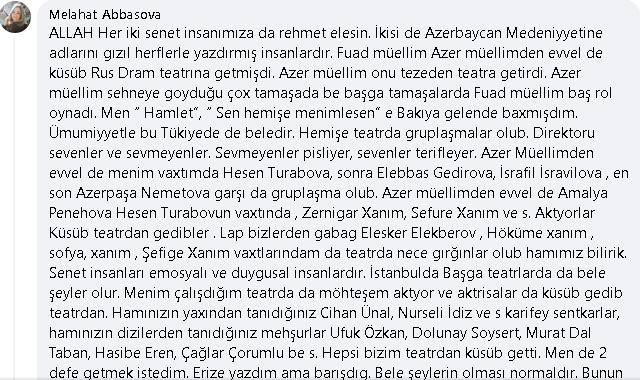 Teleqraf.com xəbər verir ki, bu fikirləri Türkiyədə yaşayan Əməkdar incəsənət xadimi, rejissor, aktrisa Məlahət Abbasova sosial şəbəkədə yazıb.