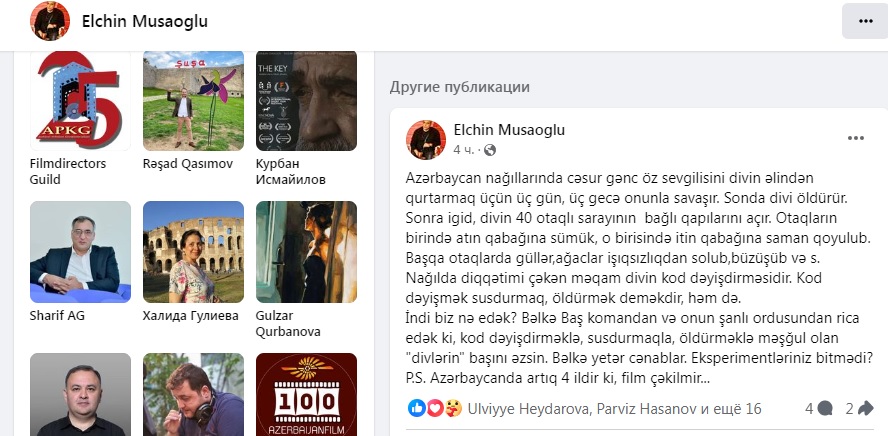 Azərbaycanda artıq 4 ildir ki, film çəkilmir..." - paylaşımda qeyd olunur.