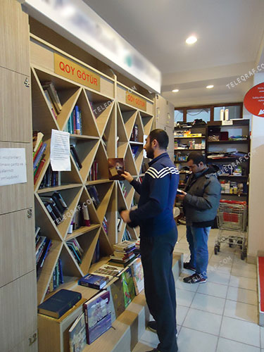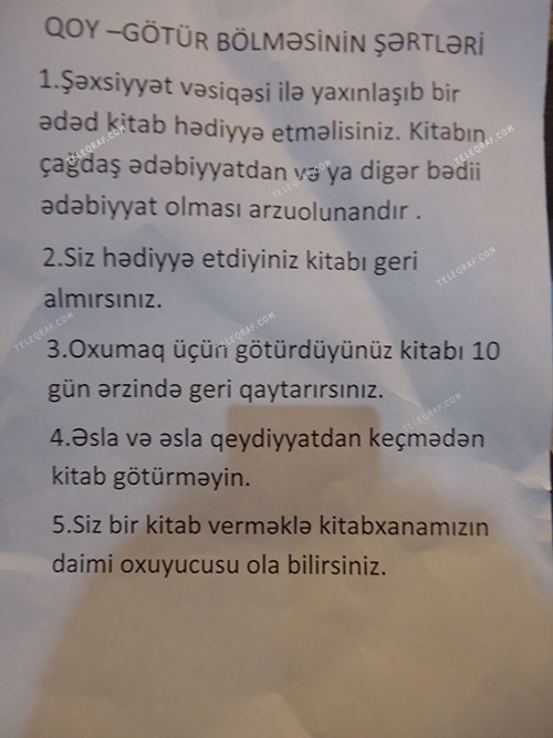 Kitabxananın xanım əməkdaşı isə “Qoy-götür” şöbəsi haqqında məlumat verir. O deyir ki, kitabxananın bu şöbəsinə bir kitab hədiyyə edib burdakı kitablardan istifadə edirsən, amma götürdüyünü on gün ərzində qaytarmalısan.