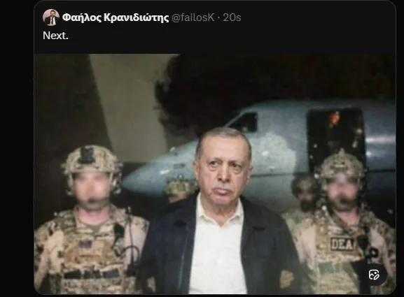 Qeyd edək ki, Yunanıstanda tanınmış siyasətçi və hüquqşünas olan Faylos Kranidiotis X-də paylaşdığı süni intellektlə hazırlanmış görüntü ilə Türkiyə və Prezident Rəcəb Tayyib Ərdoğanı hədəfə alıb. Paylaşımda guya Ərdoğanın Maduro kimi ABŞ hərbçiləri tərəfindən ələ keçirildiyini göstərən “fotoşəkil” yer alıb.