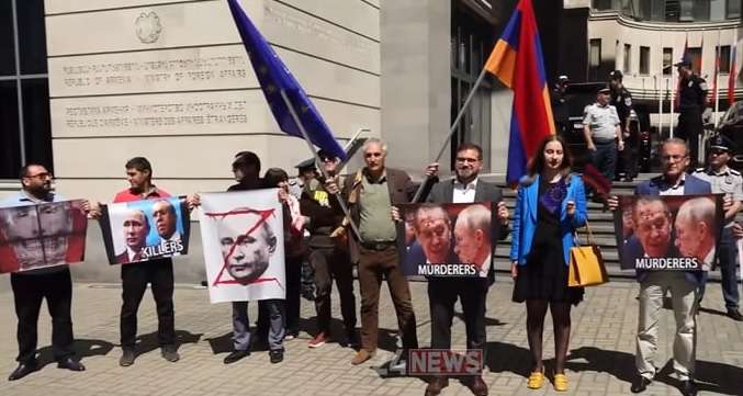 Teleqraf xəbər verir ki, “Respublika Naminə” partiyasının sədri Arman Babacanyan, Avropa partiyasının sədri Tiqran Xzmalyan və başqaları binanın qarşısında Lavrovun və Prezident Vladimir Putinin şəkillərinin üzərində “Qatillər” yazılmış plakatlarla dayanıblar.