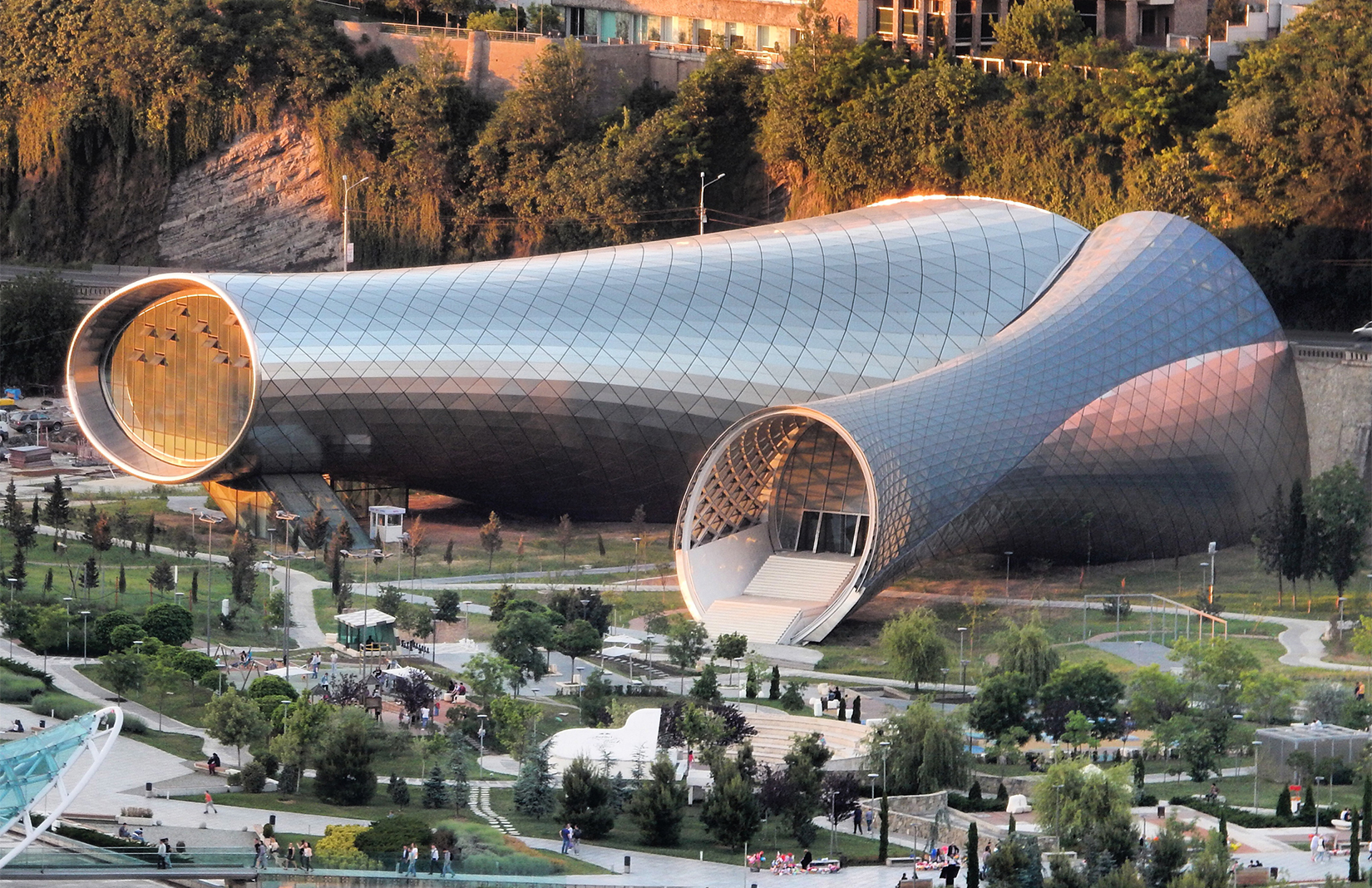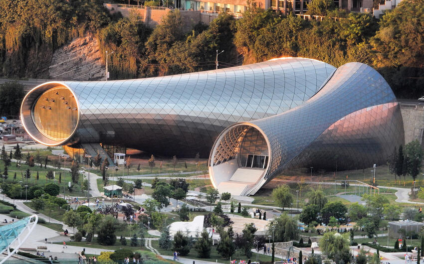 Qeyd edək ki, qeyri-adi üsluba malik kompleks 570 nəfərlik konsert zalından ibarətdir. Obyektin torpaq sahəsi ilə birgə ümumi sahəsi 14 591 kvadrat metr təşkil edir. Futuristik tikili Gürcüstanın sabiq prezidenti Mixeil Saakaşvilinin təşəbbüsü ilə italyan memar Massimiliano Fuksasanın layihəsi əsasında 2012-ci ildə inşa olunub. “Səhənglər”i 2022-ci ildə 10,02 milyon lariyə almış iş adamı Davit Xidaşeli bu yaxınlarda tikilini 20 milyon lariyə satıb. Kompleksin yeni sahibi “Rike Dom” şirkəti olub.