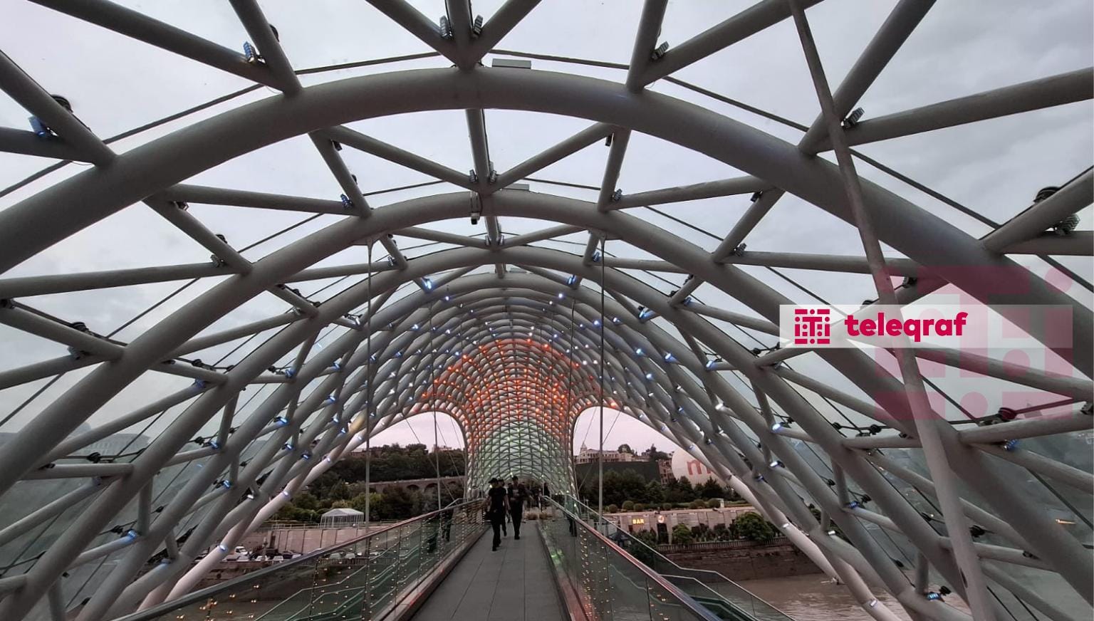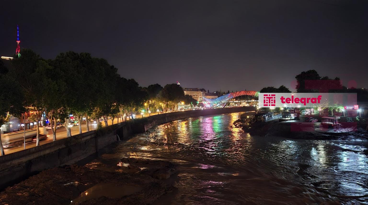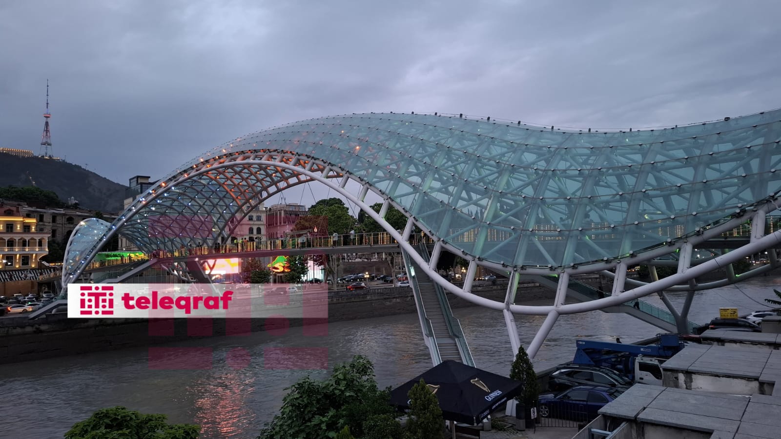 Teleqüllə və Kür çayı üzərindəki şüşəli piyada körpüsü axşam saatlarından yaşıl, qırmızı və göy rənglərlə işıq saçmağa başlayıb.