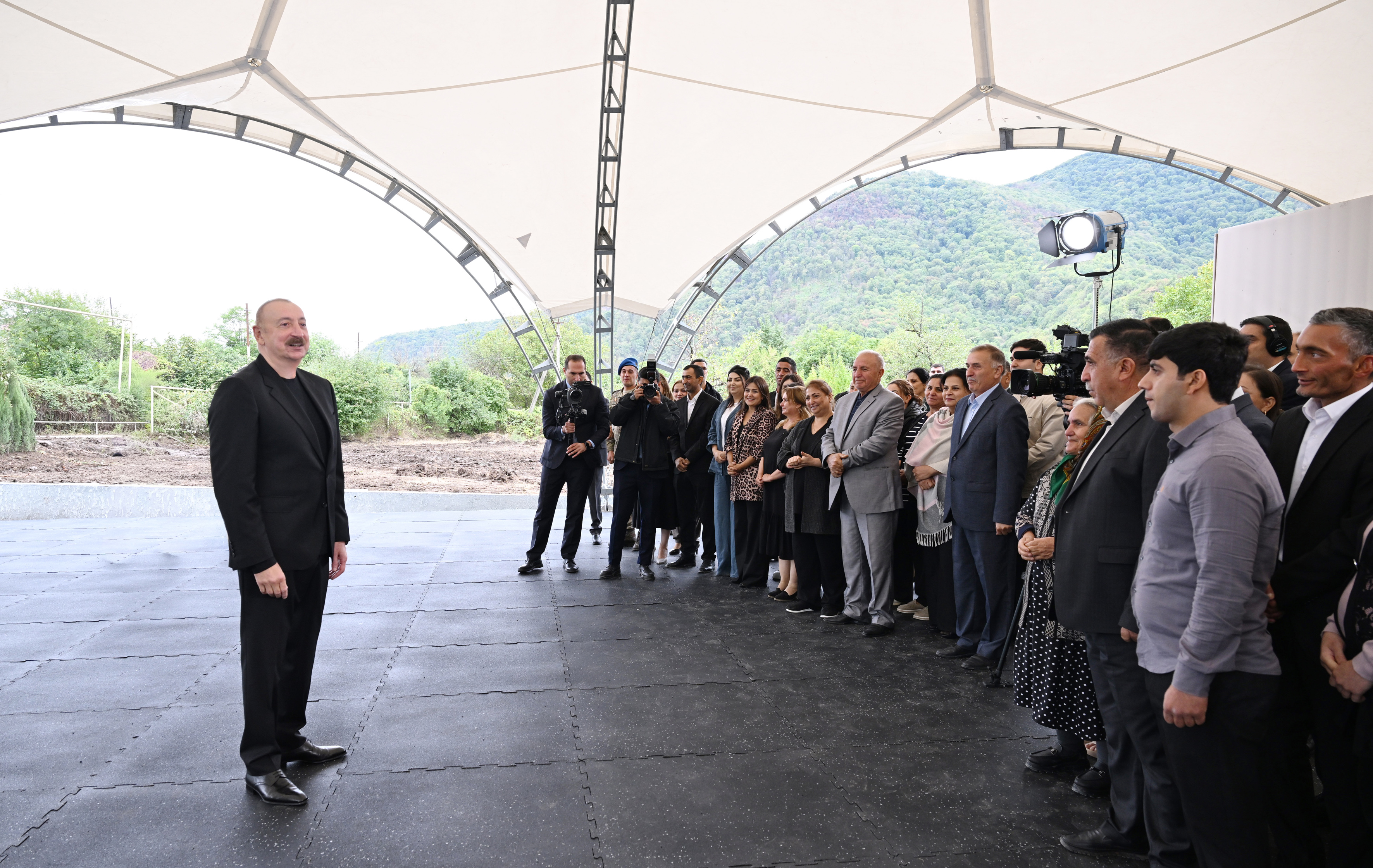 Əlbəttə ki, bütün dünya bu gün Azərbaycan haqqında danışır. Öz doğma torpağı uğrunda Azərbaycan qədər vuruşan, döyüşən, qan tökən, şəhid verən və qalib gələn ikinci ölkə yoxdur. Nə vaxtsa olar, olar, olmaz, olmaz. Qələbəmizi təmin edən xalqımızın iradəsidir, xalqımızın öz doğma torpağına olan bağlılığıdır, bizim müştərək iradəmizdir, bizim döyüşkən xasiyyətimizdir. Eyni zamanda, necə ki, döyüş meydanında düşməni məğlub etdik, onu kapitulyasiya aktını imzalamağa məcbur etdik, eyni qayda ilə sülhə də yol açdıq ki, bundan sonra heç vaxt müharibə olmasın. Biz heç vaxt müharibə istəməmişik və mən 17 il Ermənistan rəhbərləri ilə danışıqlar aparmışam. Onları inandırmağa çalışmışam ki, əgər siz öz xoşunuzla torpağımızdan çıxmasanız, müharibə qaçılmazdır. Amma onlar hesab edirdilər ki, bu olmayacaq. Hesab edirdilər ki, onların arxasında duran böyük dövlətlər, güclər, onlara silah verən, pul verən, siyasi dəstək verən onları hər dəfə, hər zaman qoruyacaq. Amma bizim iradəmizi düzgün hesablaya bilməmişdilər. Amma mən dəfələrlə onlara demişdim ki, öz xoşunuzla çıxın. Hətta İkinci Qarabağ müharibəsindən sonra, artıq bizim şanlı Zəfərimizdən sonra, Şuşanın azad olunmasından sonra onlara deyirdim ki, Azərbaycanda separatçılığa yer yoxdur. Gəlin, Azərbaycan qanunlarına tabe olun, gəlin, Azərbaycan vətəndaşlığını qəbul edin və burada yaşayın, sizə söz deyən olmayacaq. Yenə də bizə qarşı həm hərbi təxribatlar, həm siyasi təxribatlar, yekəxanalıq və faktiki olaraq, mənfi münasibət özünü göstərdi. Ona görə 19-20 sentyabr antiterror əməliyyatı onlara dərs oldu və hamıya dərs oldu. Cəmi bir neçə saat davam edən hərbi əməliyyat separatçıların kökünü kəsdi və onların ümid bağladıqları yerlər də səssiz qaldı. Çünki Azərbaycan Ordusu qarşısında heç kim dura bilməzdi, Azərbaycan xalqı qarşısında heç kim dura bilməzdi, ona görə ki, biz haqlıyıq. Bu gün haqlı olduğumuzu bir daha burada sübut edirik. Onlar şəhər və kəndlərimizi yerlə-yeksan etmişdilər, biz isə qurub-yaradırıq. Bütün Qarabağ, bütün Şərqi Zəngəzur tikinti meydançasıdır. Qısa müddət ərzində bu gözəl evlərin bərpası, tikintisi, bütün infrastrukturun yaradılması bizim gücümüzü, niyyətimizi göstərir. Əsas odur ki, bütün siyasi addımlarımızın mərkəzində Azərbaycan vətəndaşı dayanır. Siz - Azərbaycan vətəndaşları, erməni işğalından əziyyət çəkən Qarabağ bölgəsinin sakinləri bu gün ən gözəl şəraitə layiqsiniz. Mən sizi təbrik edirəm, sizə xoşbəxt həyat arzulayıram və biz burada əbədi yaşayacağıq.