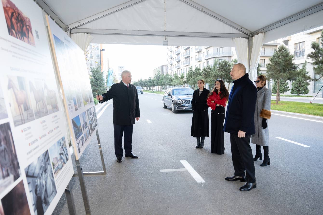 Prezident İlham Əliyev, birinci xanım Mehriban Əliyeva və qızları əvvəlcə “Qarabağ atları” heykəltaraşlıq kompleksi ilə tanış oldular. Vətən müharibəsindəki Qələbəmizə həsr edilmiş və milli irsimizin rəmzi olan bu kompleks “Qarabağ atları” meydanında ucaldılıb. Kompleksdə "Soltan", "Ürək", "Sereyin", "Aypara", "Şöhrət", "Ötqəm" və "İldırım" adlı ümumilikdə 7 Qarabağ atının heykəli var.