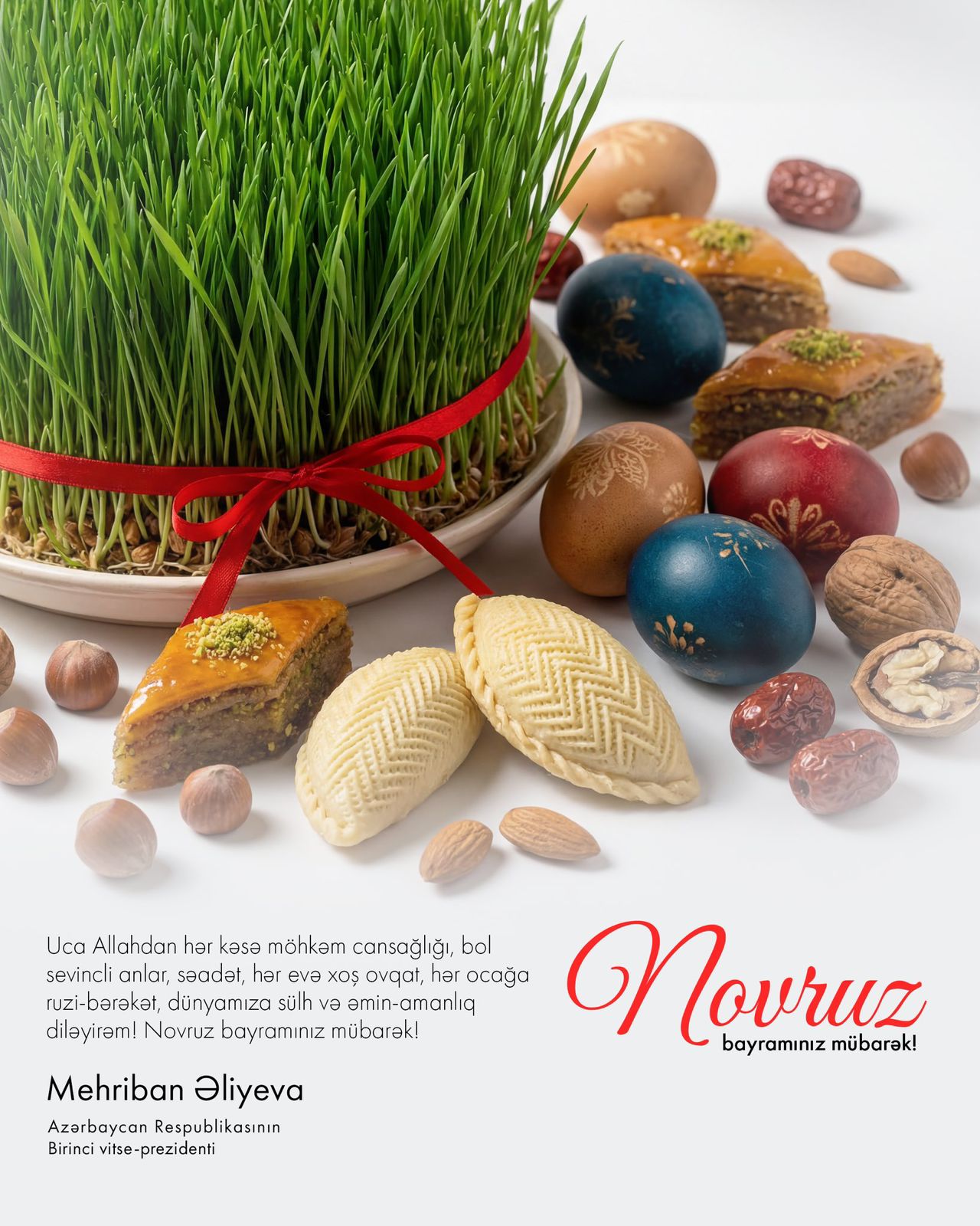 "Uca Allahdan hər kəsə möhkəm cansağlığı, bol sevincli anlar, səadət, hər evə xoş ovqat, hər ocağa ruzi-bərəkət, dünyamıza sülh və əmin-amanlıq diləyirəm! Novruz Bayramınız mübarək!"