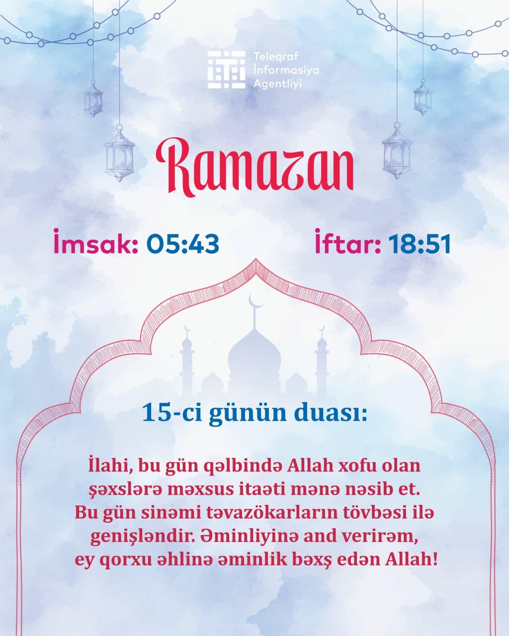 Teleqraf xəbər verir ki, Qafqaz Müsəlmanları İdarəsinin (QMİ) açıqladığı Ramazan ayının təqviminə əsasən, Bakıda imsak vaxtı saat 05:43, iftar vaxtı isə saat 18:51-dir.