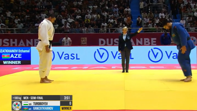 100 kq-dan yuxarı çəki dərəcəsində Camal Qamzatxanov finala vəsiqə qazanıb. O, yarımfinalda özbəkistanlı Utkirbek Turoboyevi 9 saniyəyə ipponla üstələyib. Qamzatxanovun son rəqibi tacikistanlı Temur Raximov olacaq.