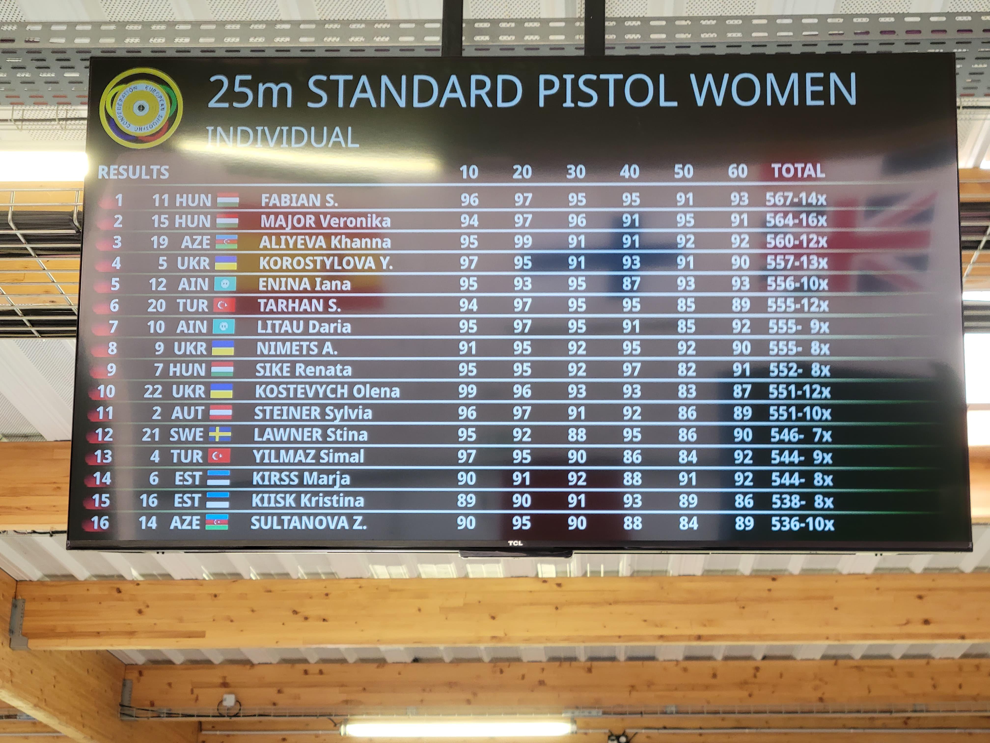 Federasiyanın mətbuat xidmətindən Teleqraf-a verilən məlumata görə, Əliyeva standart tapança ilə 25 metr məsafəyə atəş açma yarışında 560 xal və 12 daxili onluq (x) nəticə göstərib.