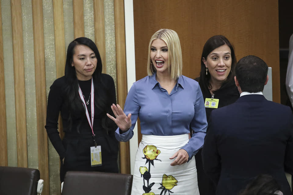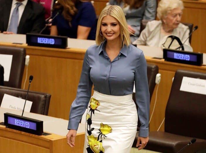 Teleqraf.com xəbər verir ki, 37 yaşlı İvanka “Prada” brendinə məxsus 2130 dollarlıq ağ ətək və sadə mavi köynəklə assambleyanın iclasına yollanıb. Prezidentin qızının büstqaltersiz salona daxil olması diqqətdən yayınmayıb.