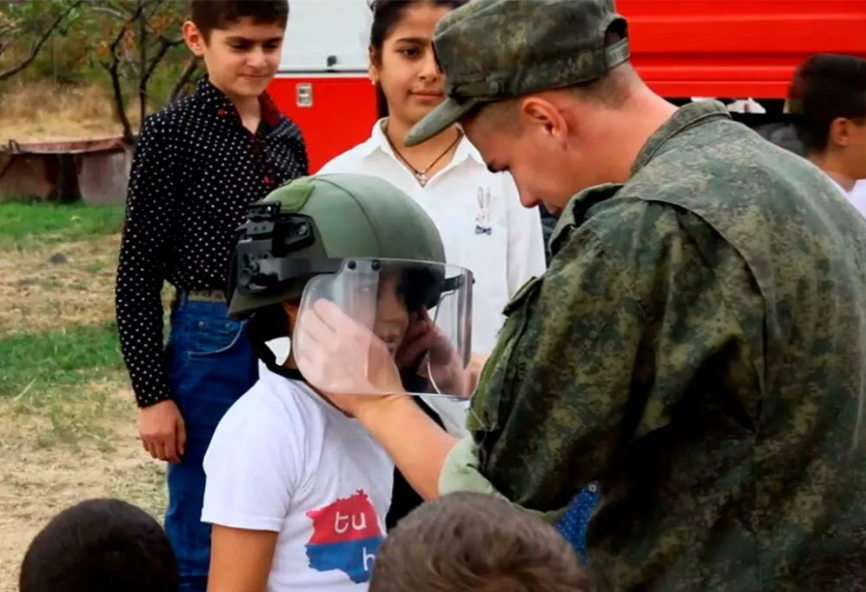 Məktəbin həyətində rus minaaxtaranlar erməni uşaqlara ərazinin minalardan təmizlənməsinin necə getdiyini və mina detektorlarının işlərini nümayiş etdiriblər.