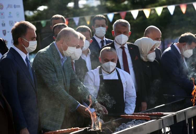 Ərdoğan manqalın ətrafına gələrək məşhur Adana kababı bişirib.