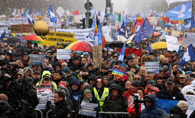 Berlində minlərlə insan Ukraynaya ağır silahların göndərilməməsi tələbi ilə etiraz aksiyası keçirib.