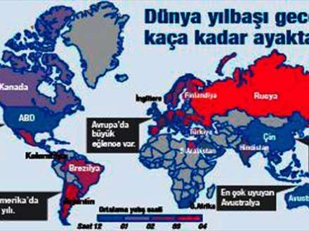 Xəritədə Avstraliya, Çin və ABŞ ən çox yatan ölkə seçilib. Xəritədə bu ölkə maviylə rəngləndirilib. Bundan başqa, saat 1-ə qədər oyaq qalmış ABŞ-a “yatağan ölkə” adı verilib. Qırmızı rənglə göstərilən Avropa ölkələri və Rusiyanın yeni il gecəsi isə əyləncəli keçib. Onlar gecə saat 4-ə qədər oyaq qalıblar. Türkiyə isə gecə saat 2-yə qədər oyaq qalmağı başarıb. Bu səbəbdən də xəritədə Türkiyə bənövşəyi rənglə göstərilib. /musavat.com/