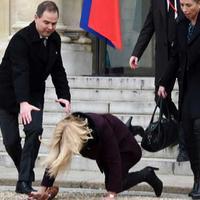 Yanındakılar baş nazirə kömək edərək yerdən qaldırıb.