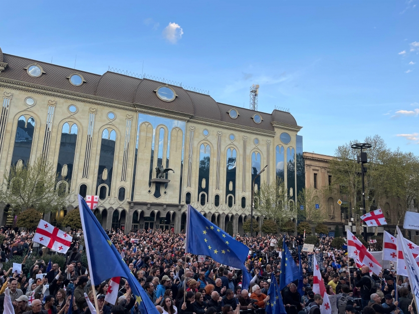 Parlamentin önündə Gürcüstan və Avropa İttifaqının bayraqlarını tutan aksiyaçılar “Rusiya qanununa yox”, “Biz Avropadayıq” kimi şüarlar səsləndirib, hökumətdən məlum qanun layihəsini parlamentin müzakirəsindən geri çağırmağı tələb ediblər.
