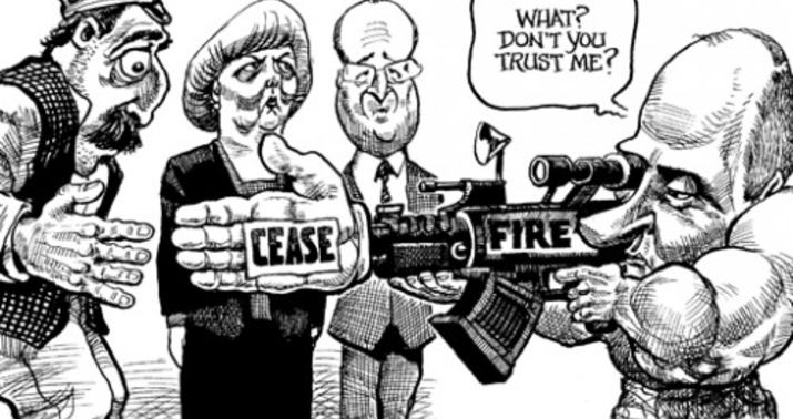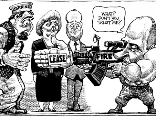 Karikaturada danışıqların 3 iştirakçısı – Rusiya prezidenti Vladimir Putin, Fransanın dövlət başçısı Fransua Olland və Almaniyanın kansleri Angela Merkel, eləcə də furajkasında “Ukrayna” yazılsa da, Belarus prezidentinə daha çox bənzəyən bir nəfəri də əks olunub.