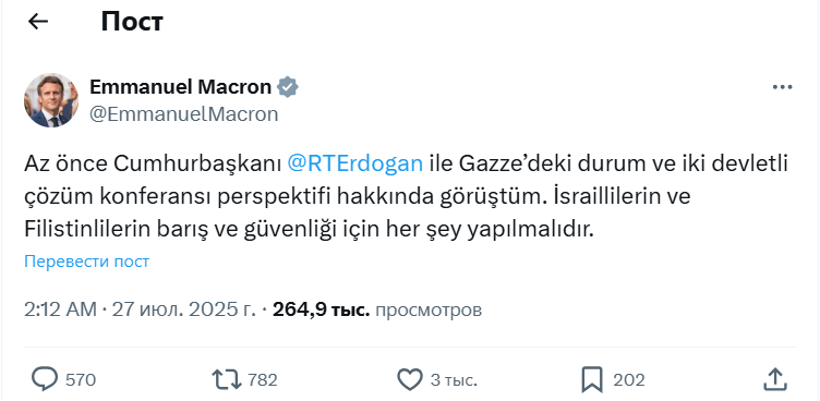 Görüşdən sonra E.Makron X sosial media platformasında türkcə palaşım edib. O yazıb: "İndicə prezident Ərdoğanla Qəzzadakı vəziyyət və ikidövlətli həlli perspektivi haqqında danışdım. İsrail və Fələstinlilərin sülh və təhlükəsizliyi üçün bütün addımlar atılmalıdır".