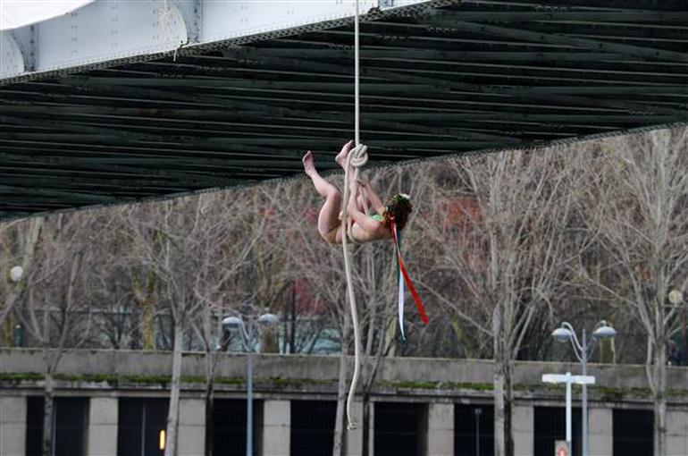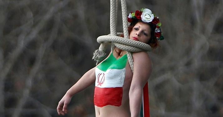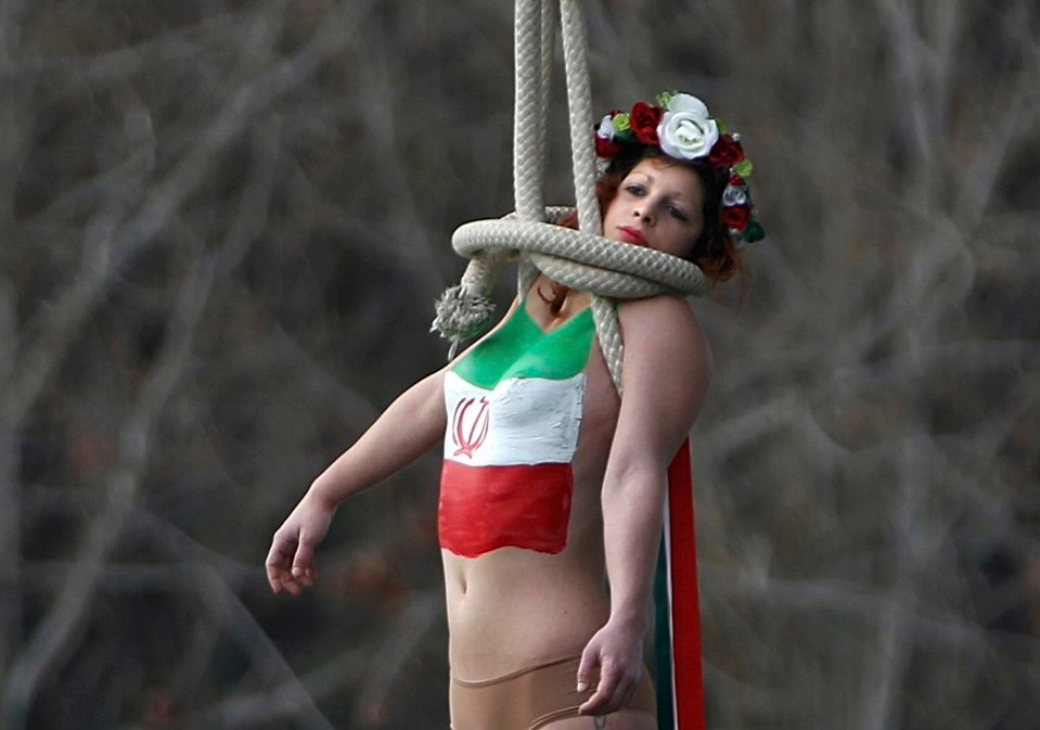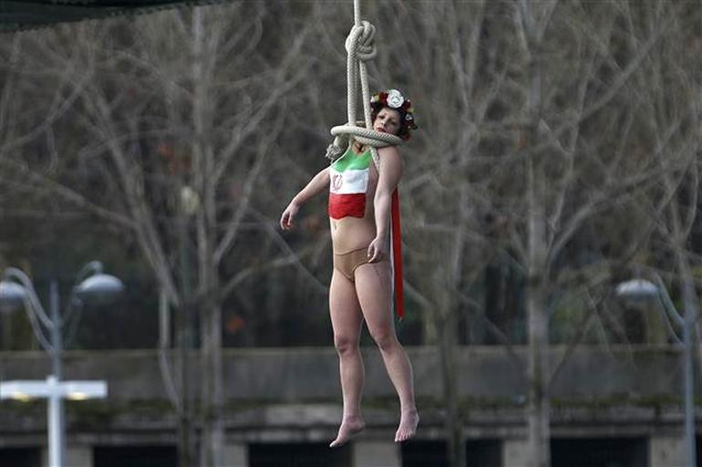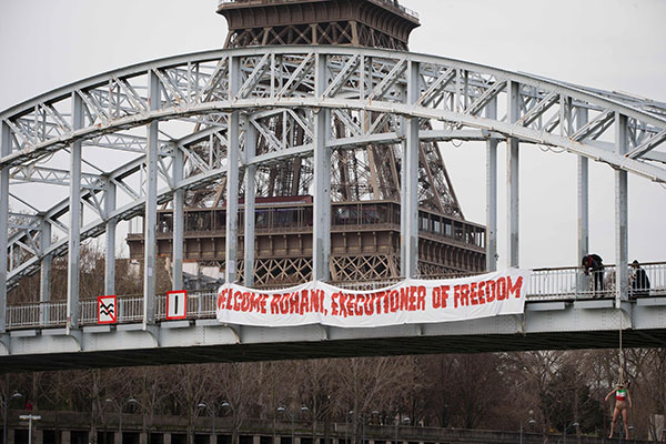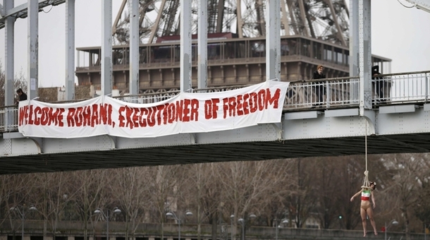 Teleqraf.com xarici mediaya istinadən xəbər verir ki, yarıçılpaq qızlar kəndirlə özlərini Parisdəki Debilli körpüsündən asıblar. Körpünün üzərində isə "Xoş gəldin, Ruhani, azadlığın cəlladı" sözləri əks olunmuş plakat asıblar. Qadınlar bununla son zamanlar İranda edamaların çoxalmasına etiraz ediblər.