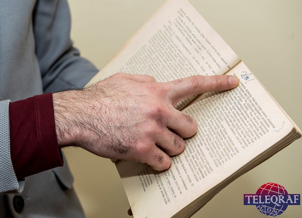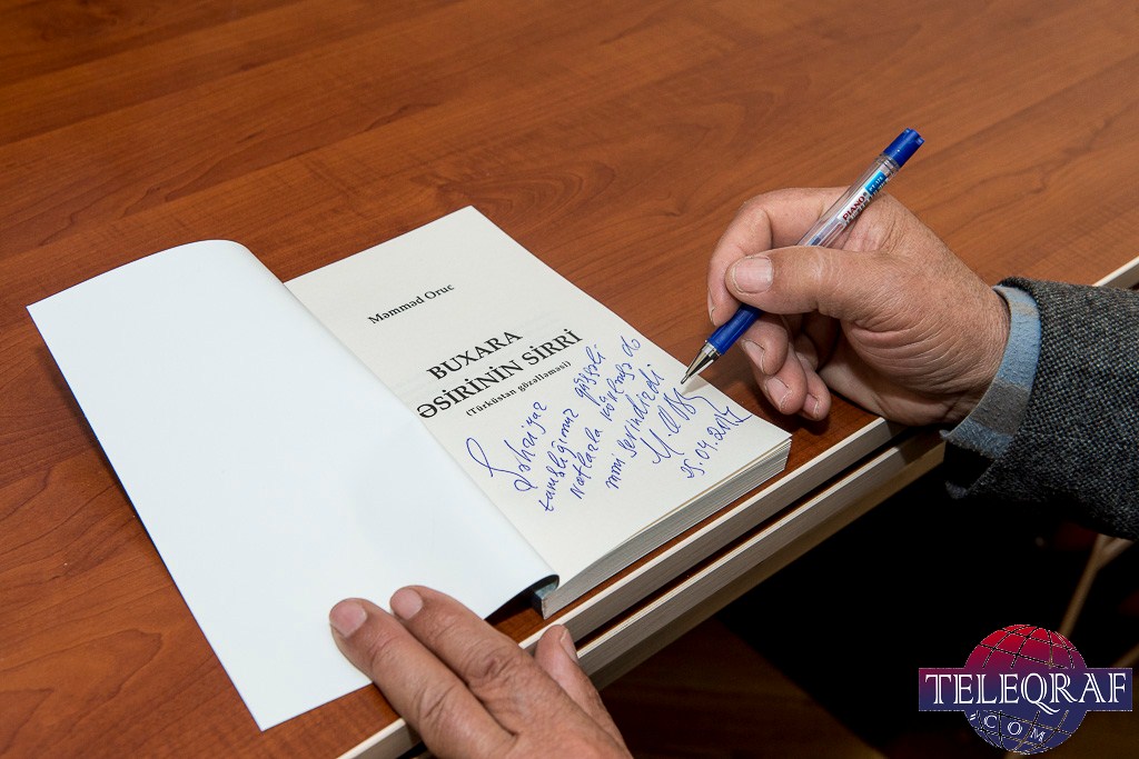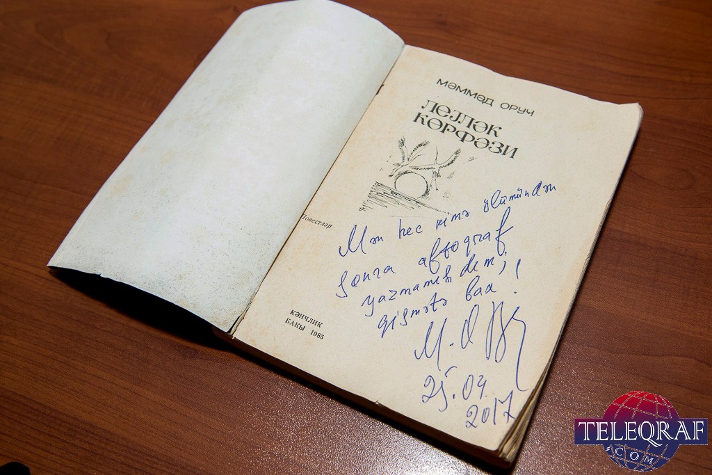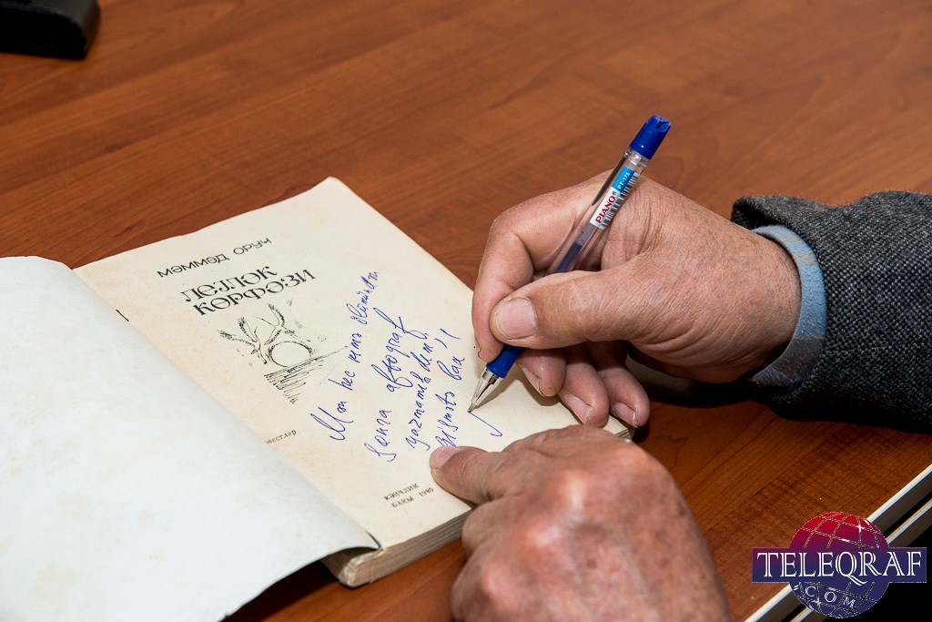 Eynəyinin üstündən baxır. Nəsə demək istəyir. Amma susur. Kitabı imzalayır.