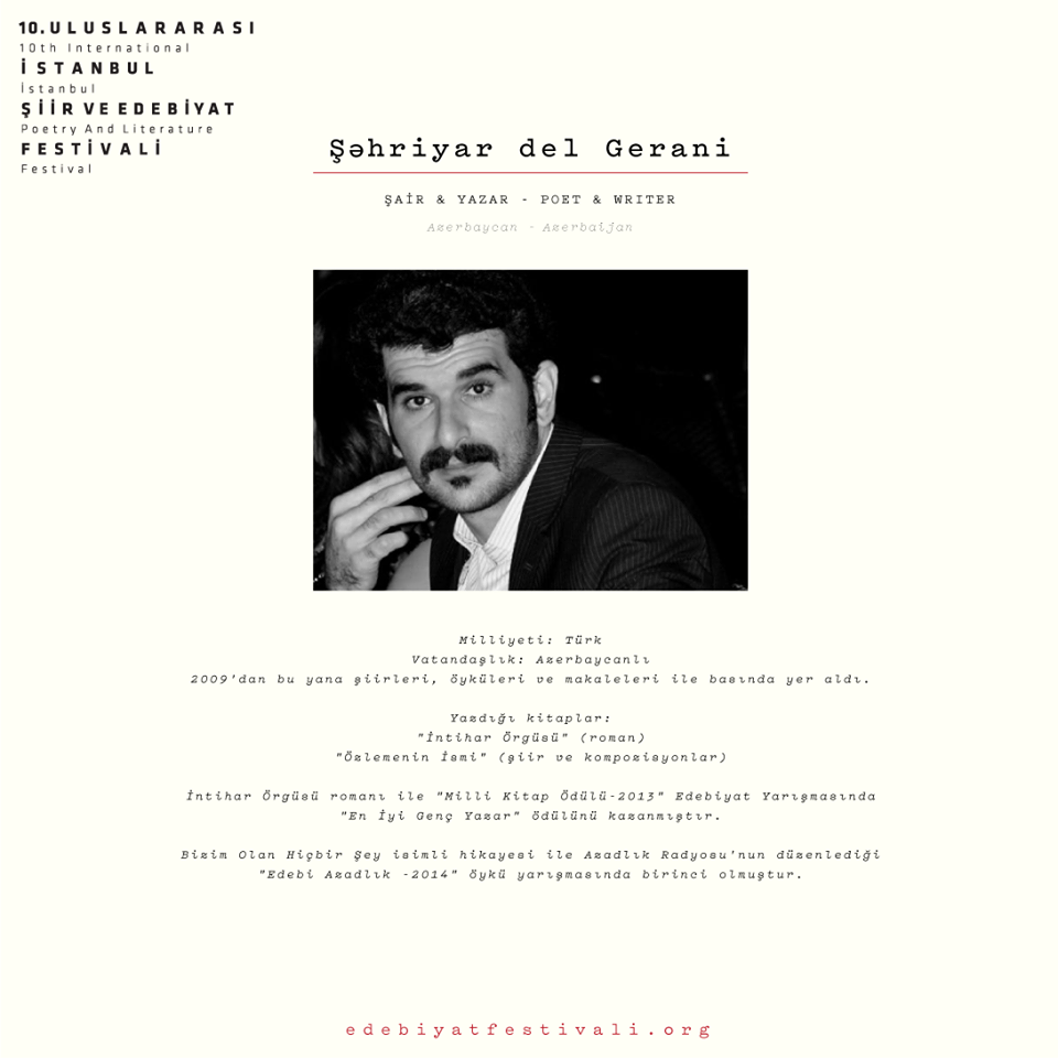 Bu gün (oktyabrın 3–7 tarixləri arasında) İstanbulda Bəyoğlu Bələdiyyəsinin təşkilatçılığı ilə X Beynəlxalq İstanbul Şeir və Ədəbiyyat Festivalı başlayır.