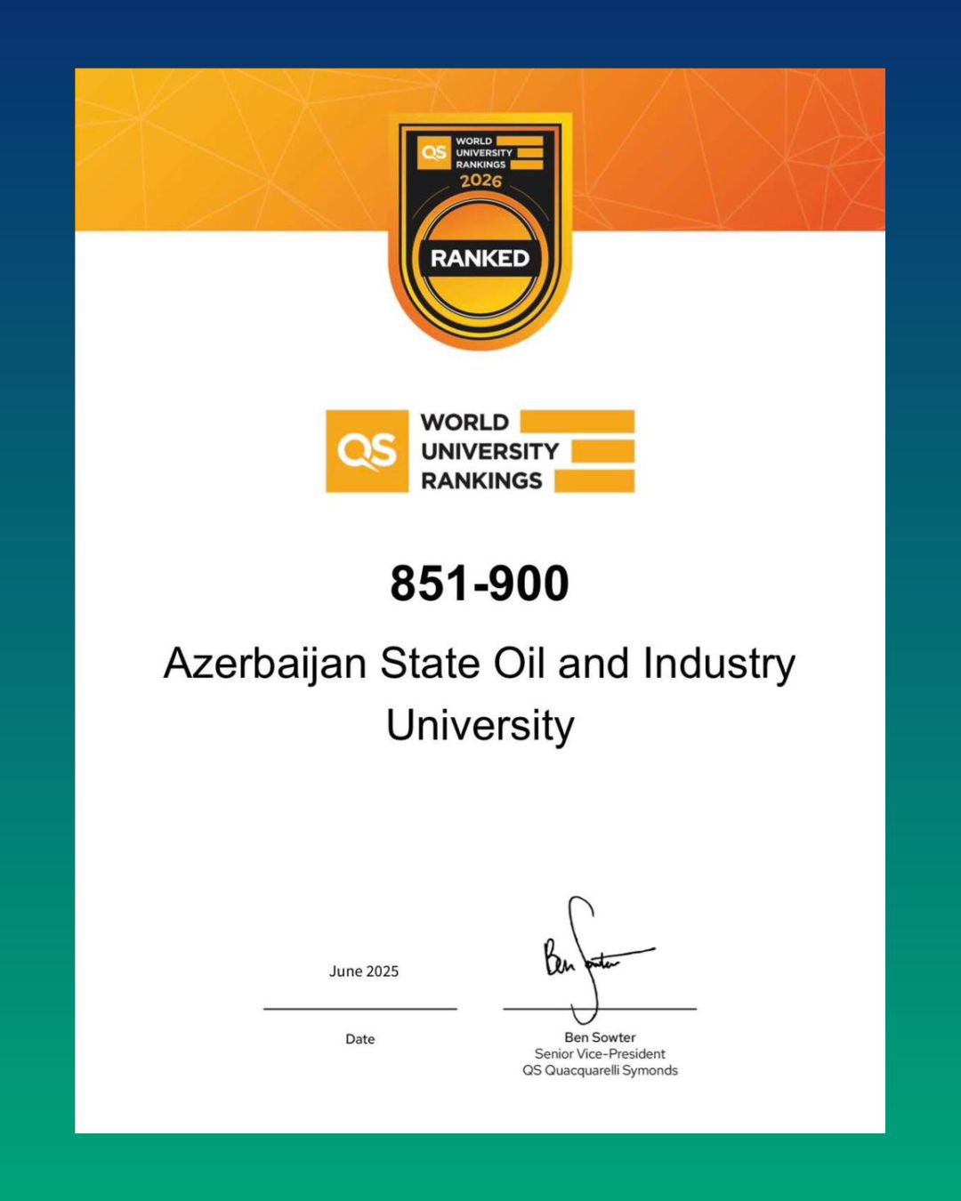 İyunun 19-da dünyanın nüfuzlu ali təhsil qiymətləndirmə agentliklərindən biri olan Quacquarelli Symonds (QS) tərəfindən universitetlərin 2026-cı il üzrə reytinq sıralaması açıqlanıb. Nəticələrə əsasən, “QS Dünya Universitetləri Reytinqi 2026”-da Azərbaycan Dövlət Neft və Sənaye Universiteti (ADNSU) ötən illə müqayisədə əhəmiyyətli irəliləyiş göstərərək 851–900-cü sıralarda yer alıb. Qeyd edək ki, QS-nin 2025-ci il üçün açıqladığı reytinqdə ADNSU 1001–1200-cü sıralarda qərarlaşmışdı.
