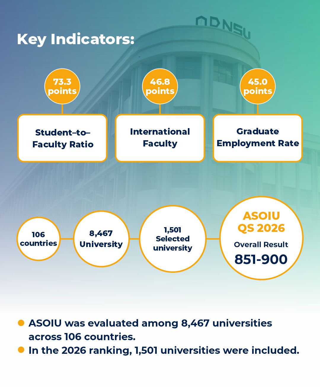 Bundan əlavə, əcnəbi müəllim heyəti üzrə göstərici 46.8 bal, məzunların işlə təminatı üzrə göstərici isə 45.0 bal olub. Bu, ADNSU-nun beynəlxalq əmək bazarına inteqrasiya olunmuş məzunlar yetişdirdiyini və akademik heyətinin qlobal rəqabətə uyğunluğunu təsdiqləyir.
