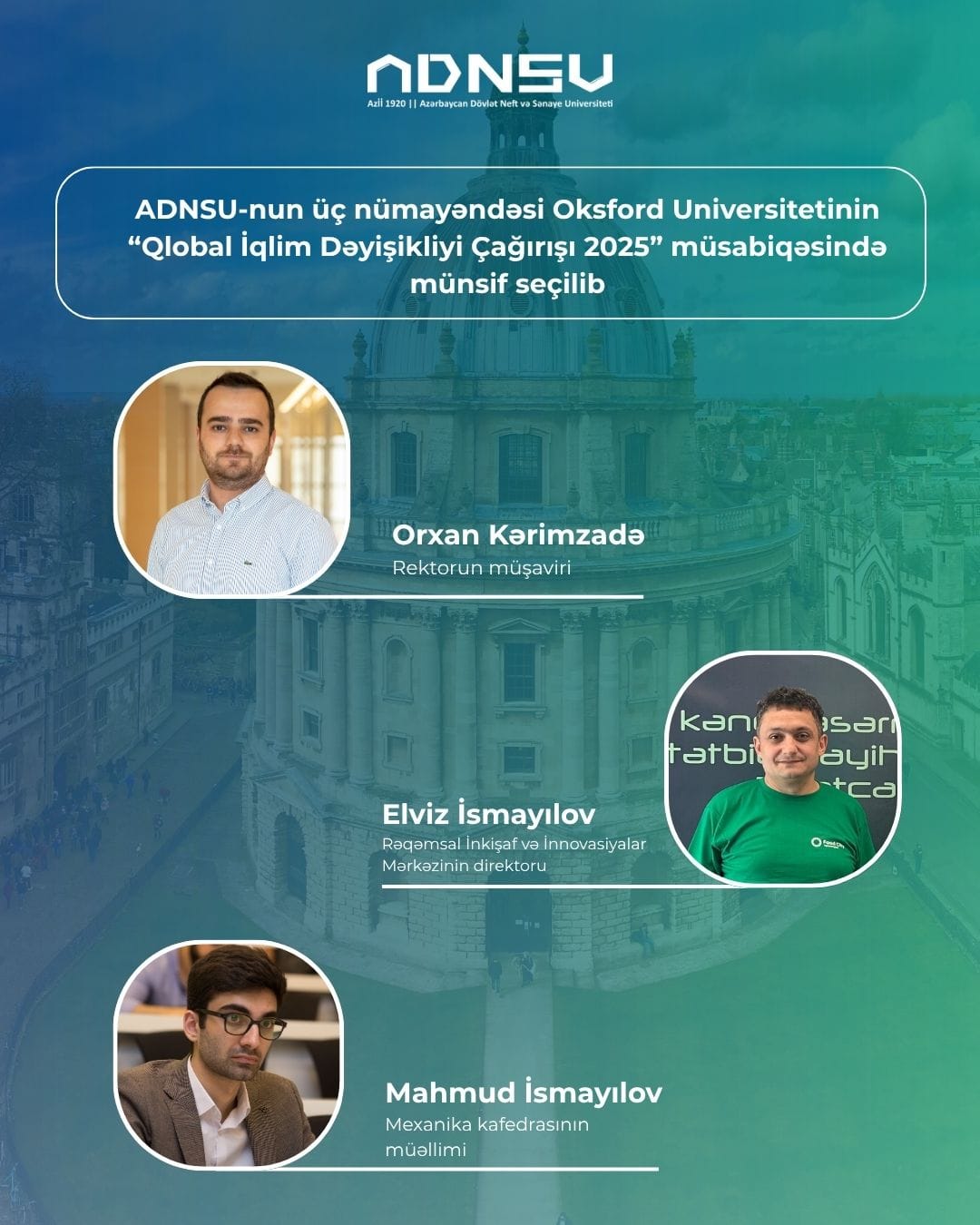 Azərbaycan Dövlət Neft və Sənaye Universitetinin üç nümayəndəsi – Rəqəmsal İnkişaf və İnnovasiyalar Mərkəzinin direktoru Elviz İsmayılov, rektorun müşaviri Orxan Kərimzadə və Mexanika kafedrasının müəllimi Məhmud İsmayılov – Oksfordun nüfuzlu “Qlobal İqlim Dəyişikliyi Çağırışı 2025” (“Oxford Saïd Global Climate Change Challenge 2025”) beynəlxalq müsabiqəsinin münsif heyətinə seçilib.