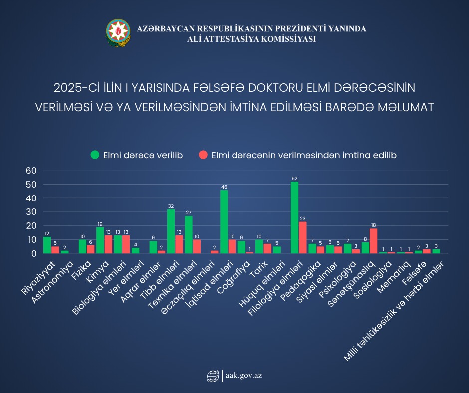 2025-ci ilin I yarısında 52 nəfərə filologiya, 32 nəfərə isə tibb elmləri üzrə fəlsəfə doktoru elmi dərəcəsi verilib.