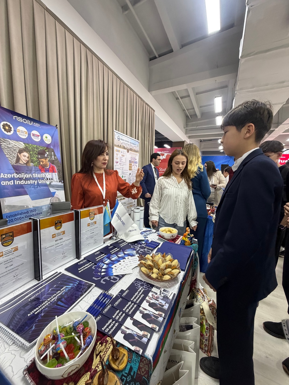 Sərgidə ADNSU-nu Əcnəbi tələbələrlə iş şöbəsinin müdiri Səbinə Əliyeva, həmin şöbənin baş mütəxəssisi İlhamə Osmanova və İctimai əlaqələr və marketinq şöbəsinin müdiri Xülya Sabirli təmsil ediblər. Universitet nümayəndələri Qazaxıstanın müxtəlif universitetlərindən gələn tələbə və məktəblilərə ADNSU-nun təhsil imkanları barədə ətraflı məlumat verib, məlumatlandırıcı çap materialları və hədiyyələr təqdim ediblər.