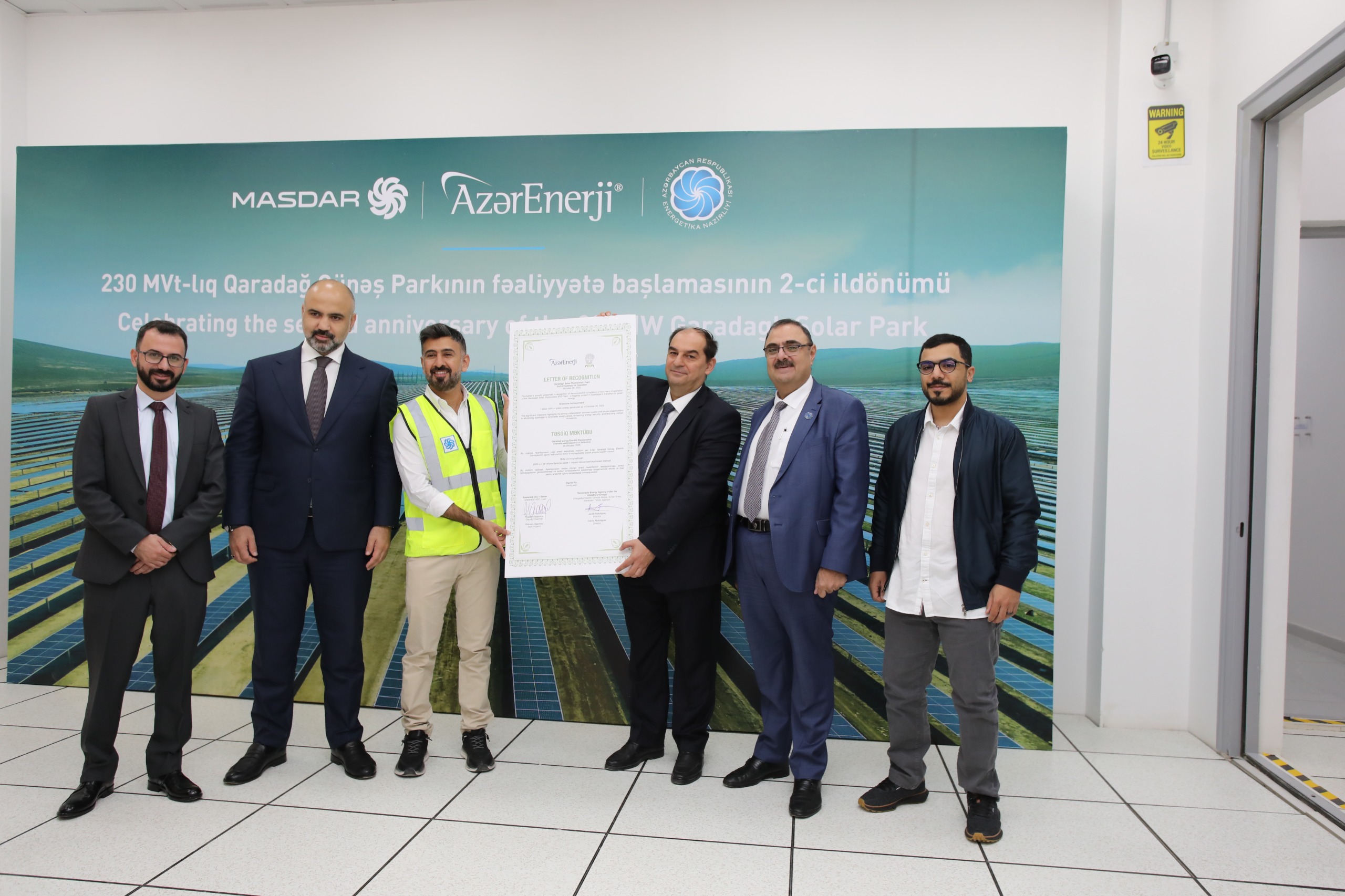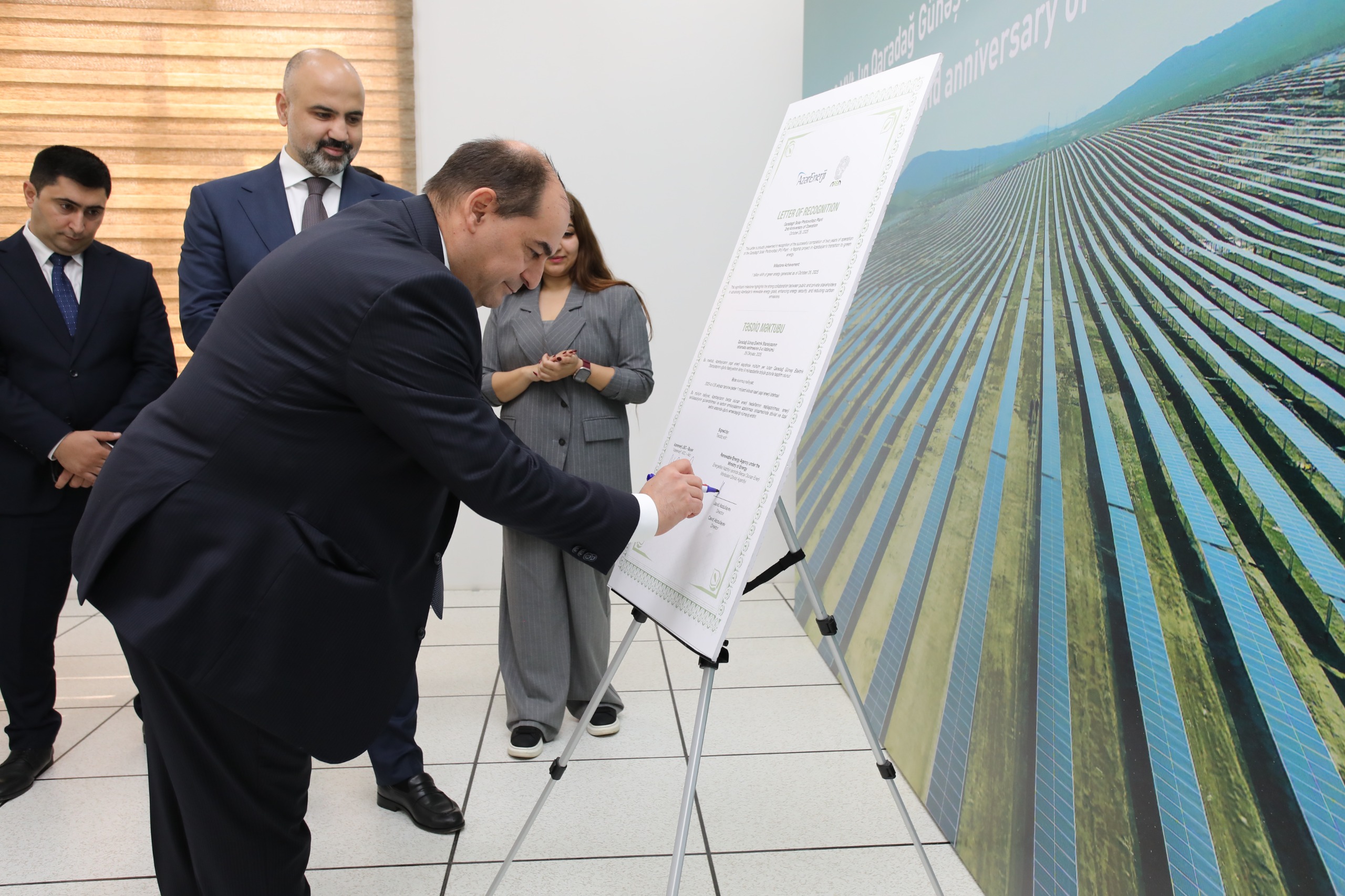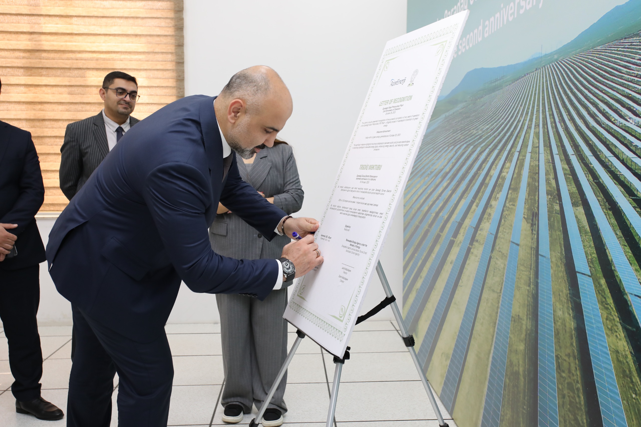 Daha sonra simvolik sertifikatın imzalanma mərasimi keçirilib. Sertifikatı Azərbaycan tərəfdən Energetika Nazirliyi yanında Bərpa Olunan Enerji Mənbələri Dövlət Agentliyinin direktoru Cavid Abdullayev və “Azərenerji” ASC-nin İdarə Heyəti sədrinin müavini Rüstəm Qasımov imzalayaraq “Masdar” şirkətinin Baş əməliyyat direktoru Əbdüləziz Alobaidliyə təqdim ediblər.