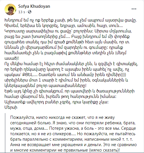 “Xahiş edirəm, heç kim heç vaxt mənim bu günün ağrısını yaşamadığımı söyləməsin. Mən bilirəm, onlar övladlarını, qardaşlarını, ərlərini, atalarını, evlərini itirdilər... İtki dəhşətlidir, ağrı isə hamımız üçündür. Ürəyim döyünür, amma mən çox danışanlardan deyiləm... Ancaq xahiş edirəm bu məsələləri mənim yazdığım şərhlə paralel götürməyə çalışmayın. Anna mənə zinət əşyalarımı və pullarımı qaytarmır. Bunlar müqayisə oluna bilməz və bir çox şərhlər yumşaq desək yersizdir!