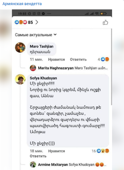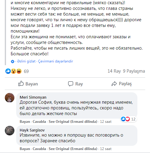 Bizim “Erməni vendettası”ndan olan həmkarlarımız Paşinyan ailəsinin keçmiş işçisi Sofiya Xudoyanın belə bir maraqlı şərhinə rast gəliblər. O, öz şərhində zinət əşyalarını geri qaytarmağı və Anna Akopyan üçün artıq sifariş edilmiş paltarların pulunu ödəməyi tələb edib.