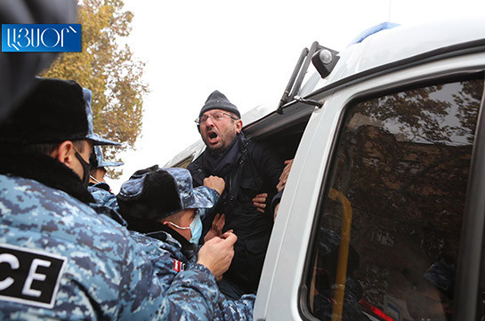 Teleqraf.com xəbər verir ki, polis Geqam Manukyanı qollarından və ayaqlarından tutaraq zorla polis maşınına mindirib polis bölməsinə aparıb.