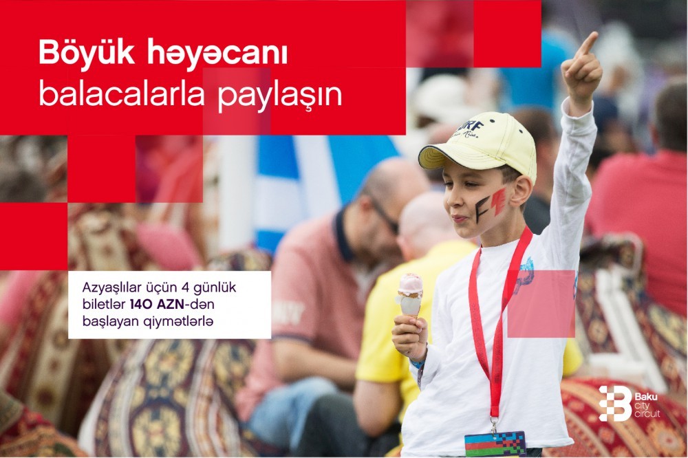 Dördgünlük bileti olan azyaşlı tamaşaçılar Azərbaycan Qran-Prisi ilə əlaqədar keçiriləcək bütün yarış sessiyalarını izləməklə yanaşı, cümə axşamı baş tutacaq “Pit yolu” gəzintisində və həmçinin yarış həftəsonu ərzində Dənizkənarı bulvar ərazisində təqdim olunan bütün əyləncə proqramlarında iştirak edə biləcəklər.