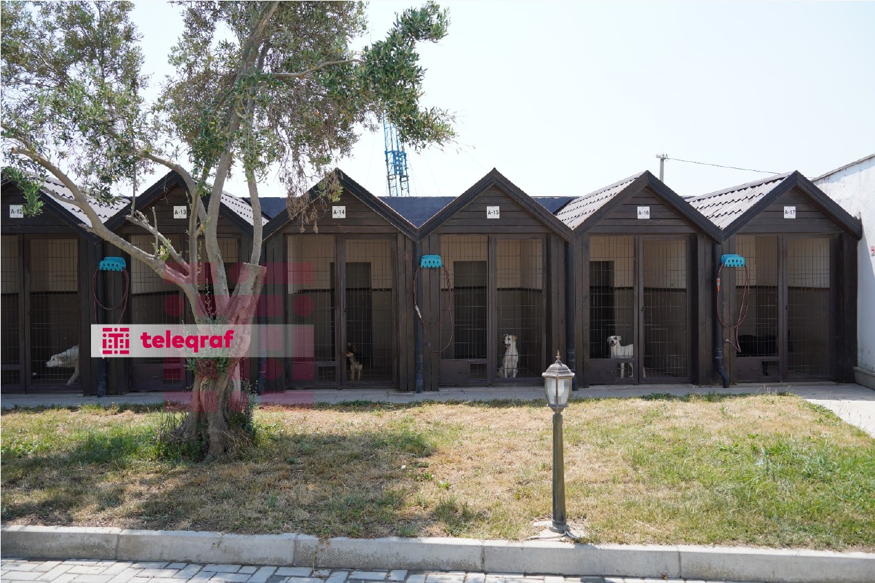 Mərkəzin geniş həyəti, sol hissədə itlər üçün xüsusi hazırlanmış sığınacaq blokları var, sanki onlar üçün kiçik evlər hazırlanıb. Burada itlər üçün tam təhlükəsiz və rahat şərait yaradılıb. Onların bəziləri tək, bəziləri isə iki-üç it birgə qalır. Aralarında bala itlər də var. Hər birinin önündə onlar üçün ayrılmış su, yem var.