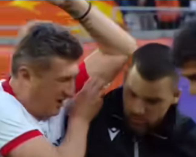 Teleqraf-ın məlumatına görə, 57 yaşlı gürcü mütəxəssis ayağında yaranan ciddi narahatlıq səbəbindən matçı erkən tərk etmək məcburiyyətində qalıb.